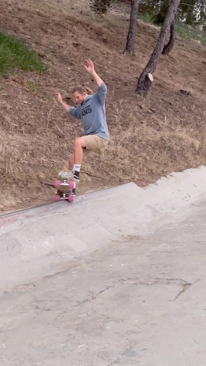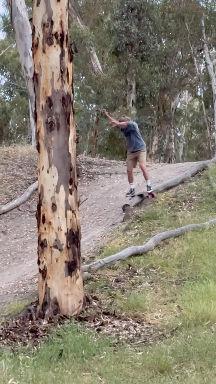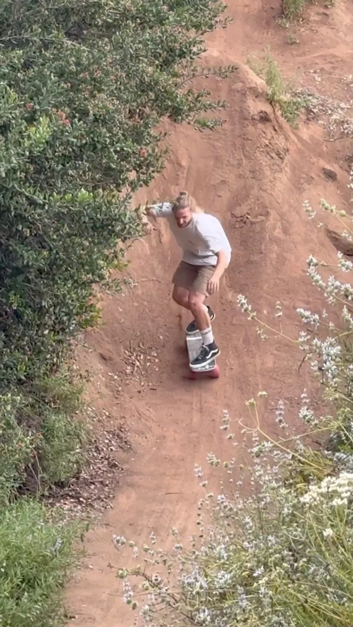 A boy riding a skateboard down a sandy slope in a natural outdoor setting with trees in the background.