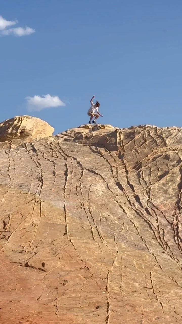 Two skateboarders standing on smooth, reddish sandstone rock formations in a desert landscape with layered cliffs in the background.